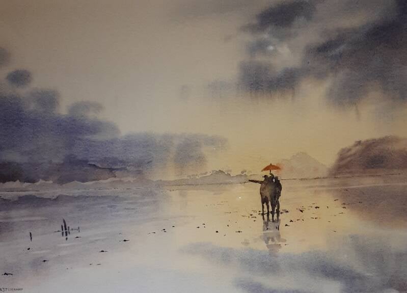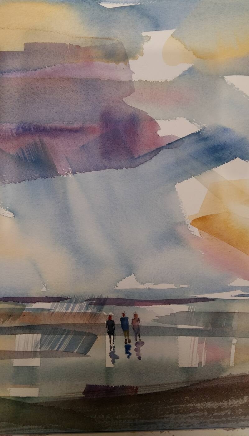 met z'n tweetjes wandelen in het wad bij laagtij - aquarel