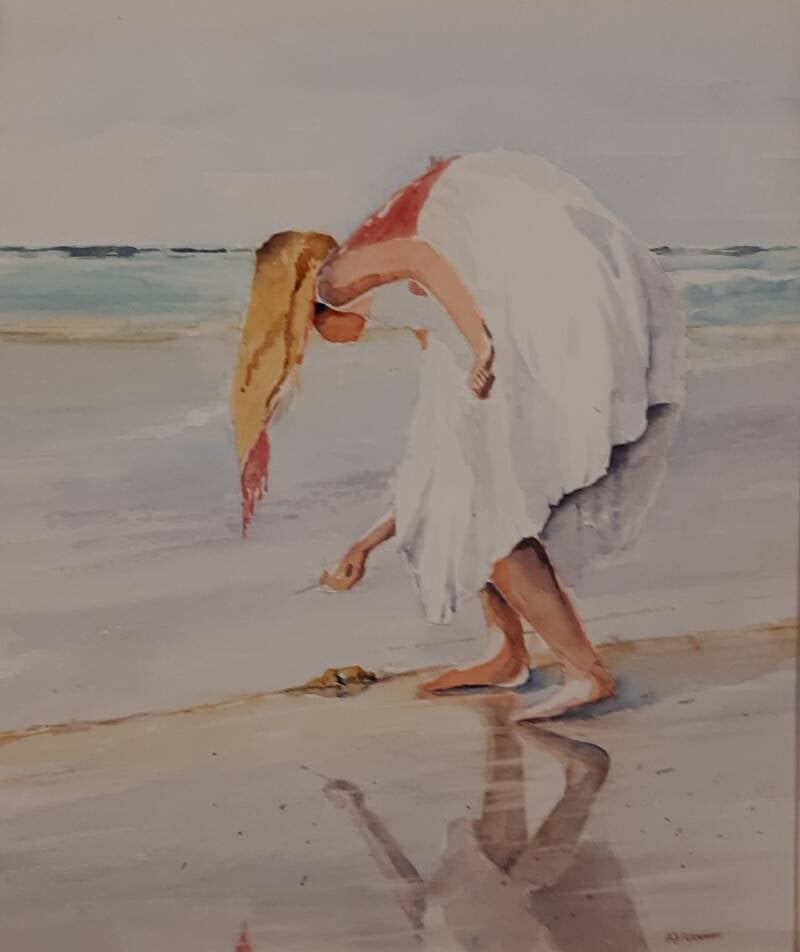 meisje op het strand van Schier bij afnemend tij - aquarel